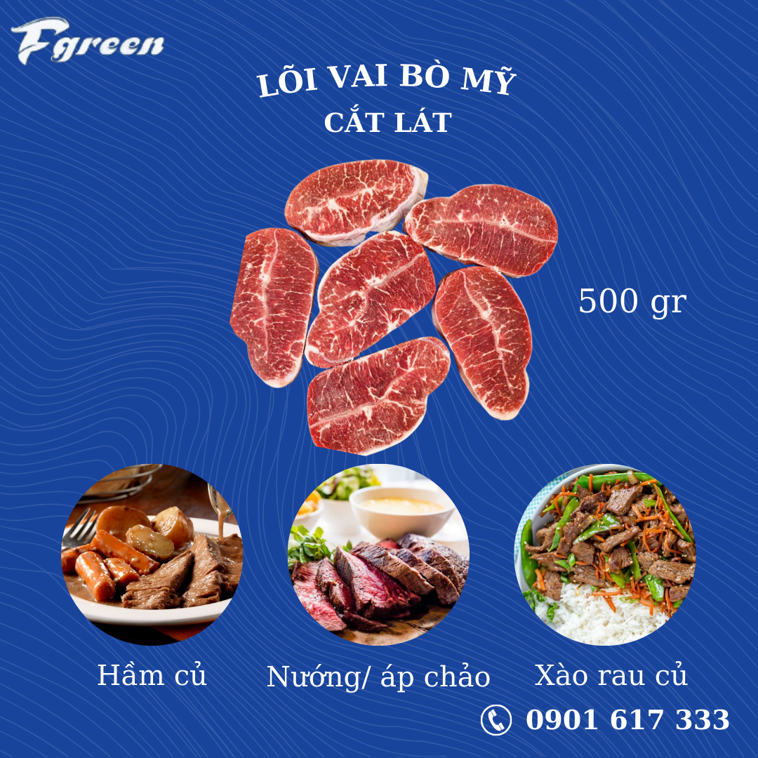 THỊT BÒ MỸ LOẠI LÕI VAI CẮT LÁTThịt bò Mỹ loại lõi vai phù hợp để chế biến nhiều món như: lẩu, nướng, xào, nhúng,... nhưng đặc biệt nhất vẫn là lõi vai áp chảo với hương thơm hấp dẫn. Lõi vai bò Mỹ (thăn vai) được pha cắt từ vùng thịt giao giữa vai và cổ của con bò, ở giữa thăn c...